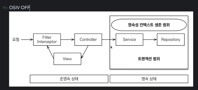 OSIV는 Open Session In View의 줄임말로, 영속성 컨텍스트를 view 즉 presentation 계층까지 열어두는 기능이다. view 단까지 영속성 컨텍스트가 열려있기 때문에 조회한 엔티티 또한 영속상태로 유지되며 따라서 view 계층에서 지연로딩을 사용할 수 있다. 스프링에서 해당 기능은 기본적으로 on되어 있으며 해당 기능을 끄기 위해서는 다음과 같이 설정해주면 된다.