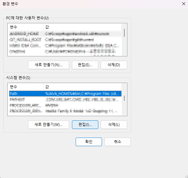 시스템 변수의 Path를 찾아 더블 클릭하거나 편집 버튼을 누른 뒤 다음과 같이 설치 경로를 추가해준다,