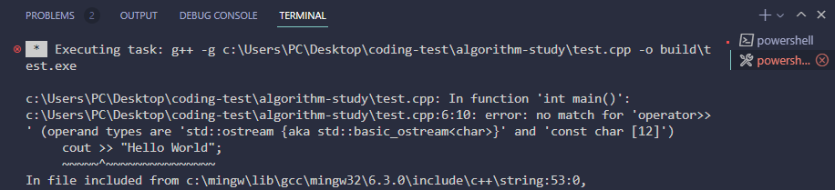 만약 컴파일 시 오류가 발생하면 다음과 같이 오류 메시지가 출력된다.