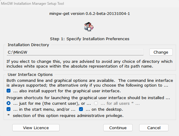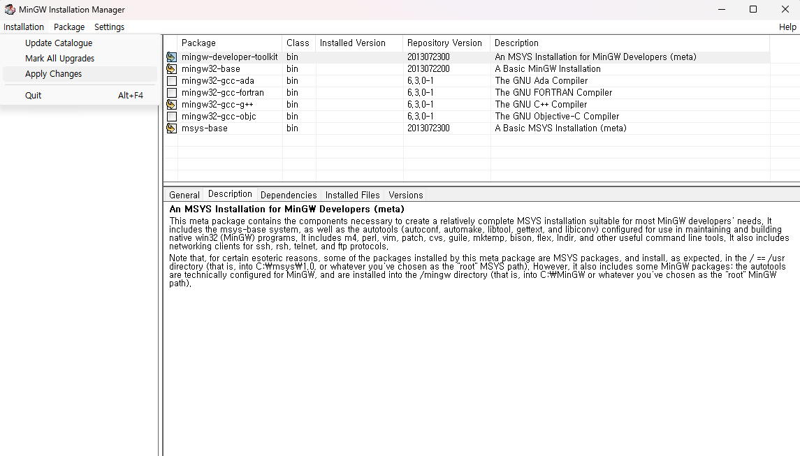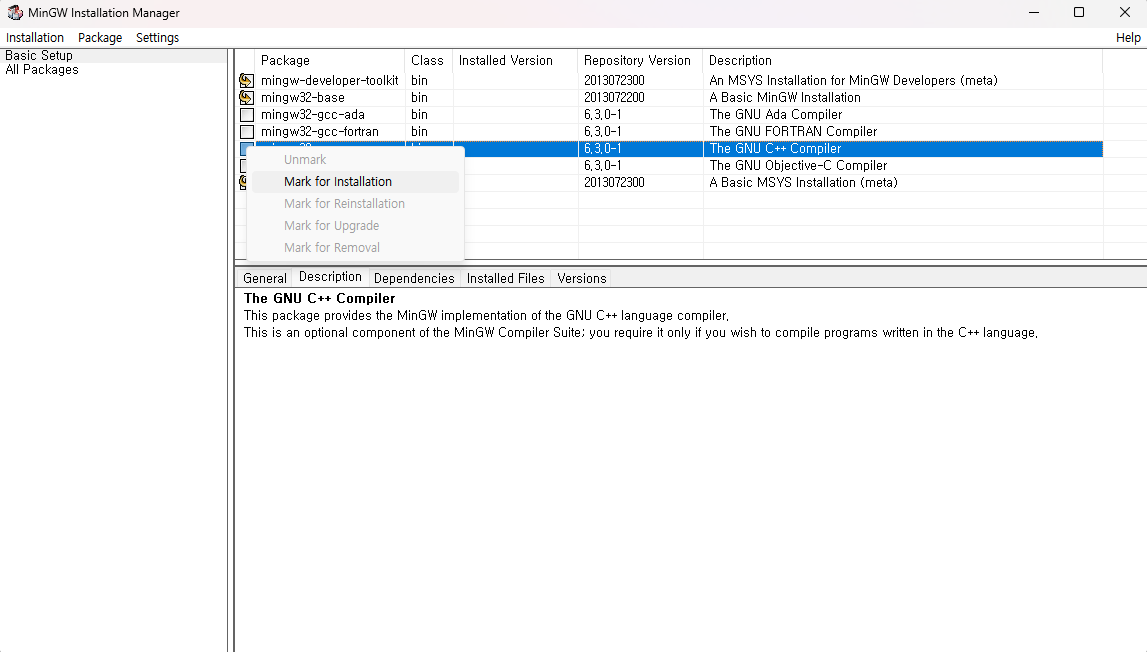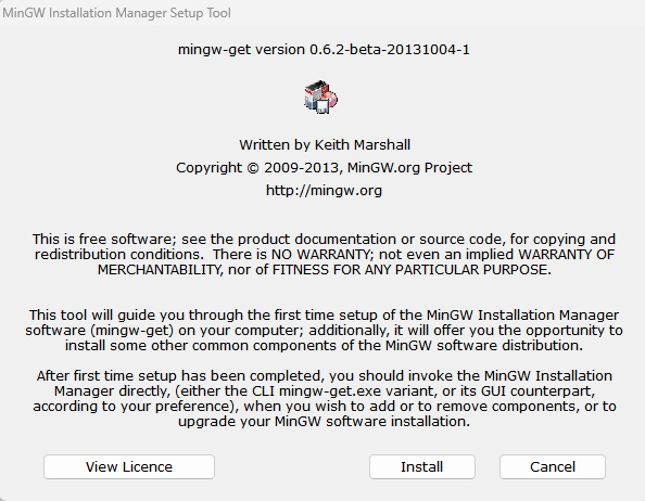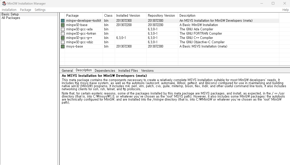 먼저 해당 웹사이트에서 mingw-get-setup.exe 파일을 다운로드 받고 설치를 진행한다. exe 파일을 실행시키면 다음과 같이 설치 관리창이 뜬다.