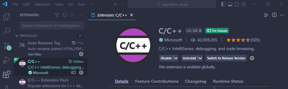 VSCode에서 해당 Extenstion을 설치한다. 위 스크린 샷은 설치 완료 이후로 설치 전에는 install 버튼이 활성화 되어있는 상태이다.