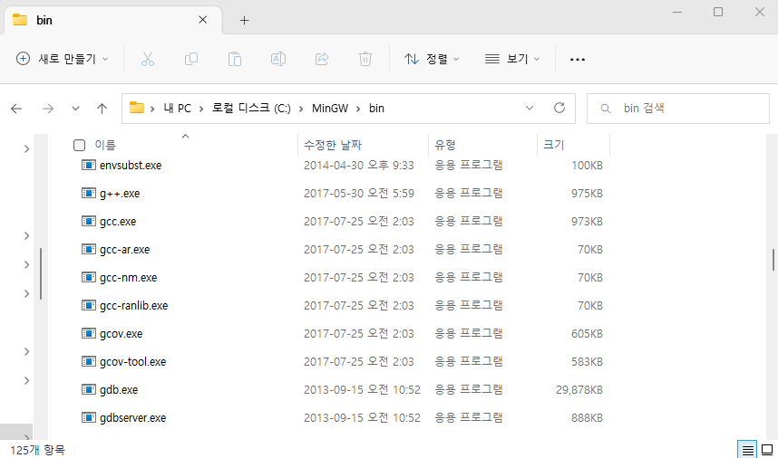 아래와 같이 설치 경로(C:\MinGW\bin)에 exe 파일들이 설치된 것을 확인할 수 있다.