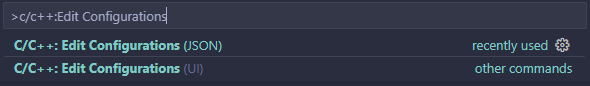 F1을 눌러 C/C++: Edit Configurations (JSON)을 클릭하면 c_cpp_properties.json 파일이 자동으로 생성된다.