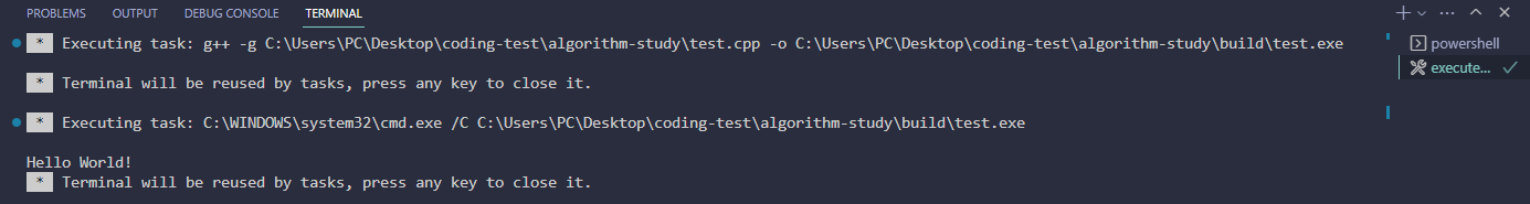 컴파일 단축키는 Ctrl + Alt + c로, 실행은 Ctrl + Alt + r로 변경하였다. 기존 workbench.action.tasks.build 단축키는 Ctrl + Shift + b, workbench.action.tasks.test에는 단축키가 할당되어있지 않다고 한다.
