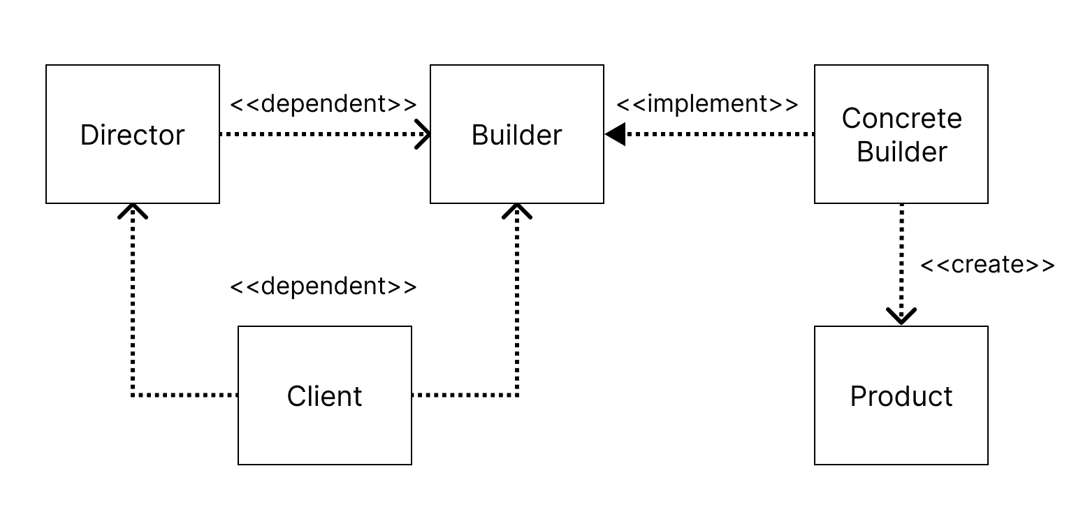 가장 기본적인 빌더 패턴은 다음과 같은 요소로 구성된다. 이제 각 구성 요소에 대해 자세히 알아보자.