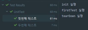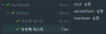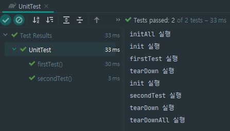 기본적인 테스트 클래스의 형태는 위와 같다. @BeforeEach, @BeforeAll, @AfterEach, @AfterAll은 각 테스트 또는 모든 테스트의 실행 앞뒤로 호출되는 라이프사이클 메소드이다. 실제 테스트 결과 화면은 다음과 같은데 각각의 firstTest, secondTest 앞뒤로 @BeforeEach, @AfterEach 메소드가 호출되고, 모든 테스트가 실행되기 전, 모든 테스트가 실행된 후로 딱 한번만 @BeforeAll, @AfterAll 메소드가 호출되는 것 또한 확인할 수 있다.