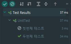 @DisplayName 어노테이션의 value 속성에 원하는 이름을 설정해주면 테스트 결과 화면에 다음과 같이 나타난다. 참고로 각 테스트 목록을 클릭하면 테스트별 실행 결과를 확인할 수 있다.