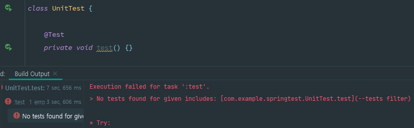 테스트 클래스, 테스트 메소드, 라이프사이클 메소드의 접근제한자는 public일 필요는 없지만 private이어서는 안된다. JUnit에서는 특별한 이유가 아니라면 public 접근제한자를 생략하는 것을 권장한다. (테스트 메소드를 private 접근제한자로 선언한 후 전체 테스트를 실행하면 private 선언된 테스트 메소드는 마치 @Disabled 어노테이션을 붙여준 것처럼 호출되지 않는다. 그러나 해당 테스트 메소드만을 선택하여 실행하면 테스트를 찾을 수 없다는 오류가 발생하므로 테스트 메소드에는 기본적으로 접근제한자를 붙이지 않는다 라고 기억하면 된다.)