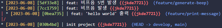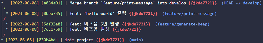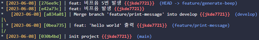 feature/generate-beep 브랜치도 fast-forward 하지 않고 바로 develop 브랜치에 병합해준다. 이 경우 커밋 그래프는 다음과 같다.