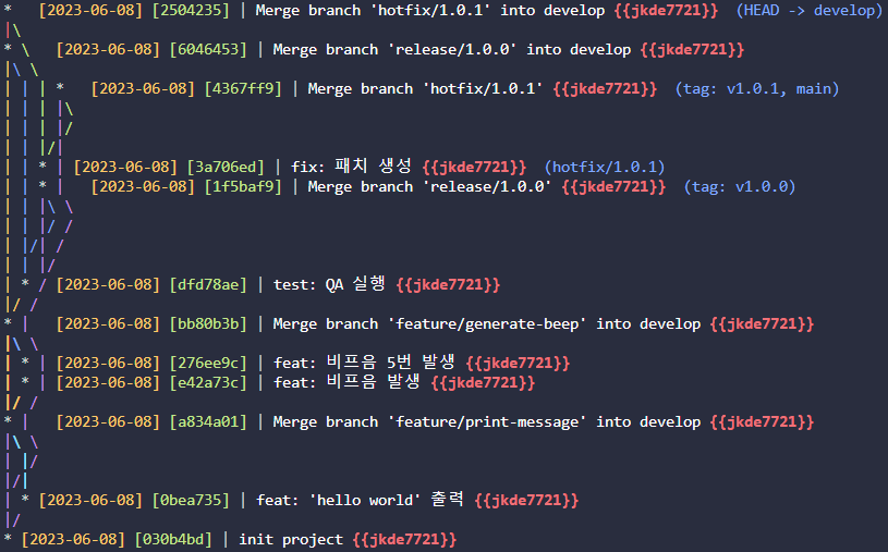아래 커밋 그래프에서 3a706ed 커밋이 main, develop 브랜치에 병합된 것을 확인할 수 있다. 또한 main 브랜치의 해당 병합 커밋에 v1.0.1 태그를 붙여주었다.
