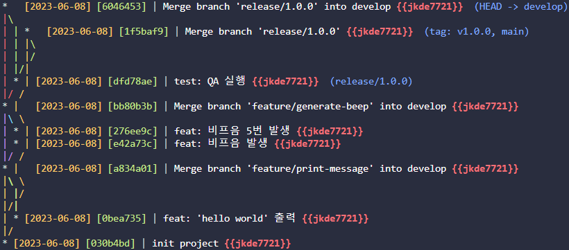 아래 커밋 그래프에서 dfd78ae 커밋이 main, develop 브랜치에 병합된 것을 확인할 수 있다. 또한 main 브랜치의 해당 병합 커밋에 v1.0.0 태그를 붙여주었다.