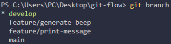 우리가 개발하고자 하는 기능은 '메시지 출력', '비프음 발생'이므로 2개의 feature 브랜치를 생성한다. feature 브랜치의 이름은 통일성만 있다면 아무렇게나 지어도 상관없지만, 다음 글에서 설명할 Git Flow Extension Library에서 기본적으로 생성하는 feature 브랜치 이름은 'feature/<기능 이름>' 형태이므로 이렇게 생성해준다.
