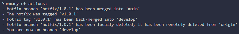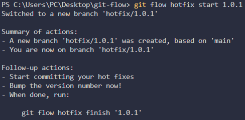 다른 브랜치들과 마찬가지로 start 명령어로 hotfix 브랜치를 생성할 수 있으며 생성 후 해당 브랜치로 checkout 된다.