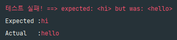 assertEquals("hi", "hi", "테스트 실패!"); //expected, actual, message