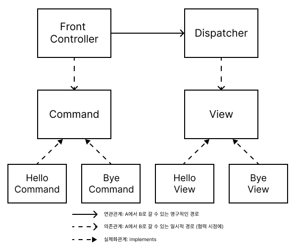 Command는 요청 별로 적절한 처리를 수행한다. 스프링에서의 우리가 아는 일반적인 Controller에 대응된다. 실제로는 데이터 조회, 비즈니스 로직 처리 등 더 복잡한 처리를 수행하지만, 현재 구현된 Command는 단순히 전달받은 요청에 따라 콘솔에 출력할 뷰의 이름을 반환하기만 한다.