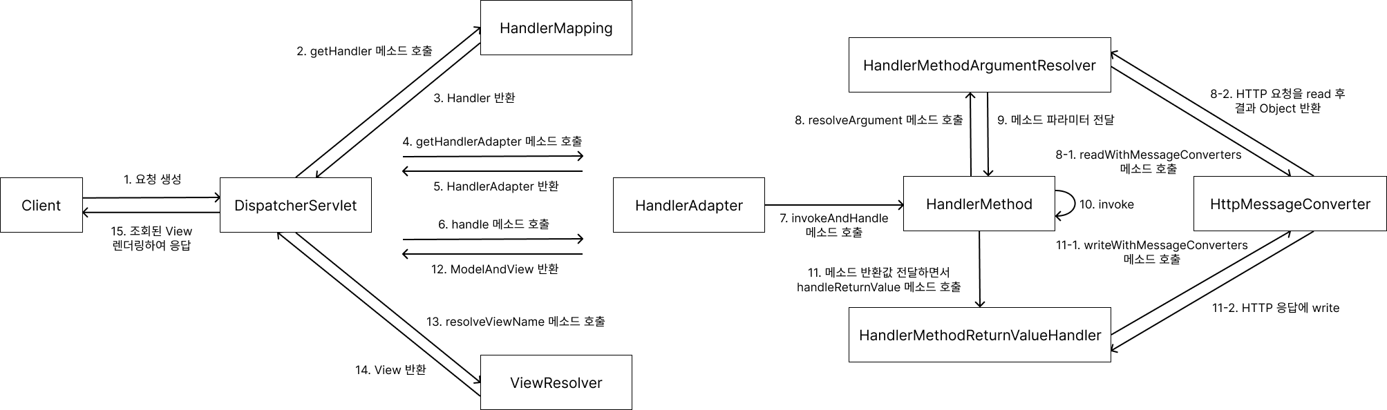 구현의 용이성을 위해 위와 같이 단순화하였으나 실제 스프링에서는 메소드 시그니처의 유연성을 위해 Handler 외의 추가적인 클래스가 존재하는데 바로 HandlerAdapter이다. 핸들러의 메소드가 어떻게 정의되어 있든지 해당 메소드에 알맞은 파라미터를 전달해주고 메소드의 반환값을 처리하여 이를 클라이언트에게 응답으로 전달해준다. 당연히 이러한 모든 책임을 HandlerAdapter가 지니고 있다면 이 또한 SRP 원칙에 부합하지 않는다. 따라서 스프링에는 HandlerMethodArgumentResolver, HandlerMethodReturnValueHandler 라는 클래스가 추가로 존재하는데 각각은 핸들러 메소드의 파라미터로 적절한 객체를 생성하여 전달해주는 역할을, 핸들러 메소드의 반환 객체를 처리하여 응답으로 사용할 수 있도록 하는 역할을 한다. 보다 자세한 내용은 밑에서 다시 정리해보기로 하자.