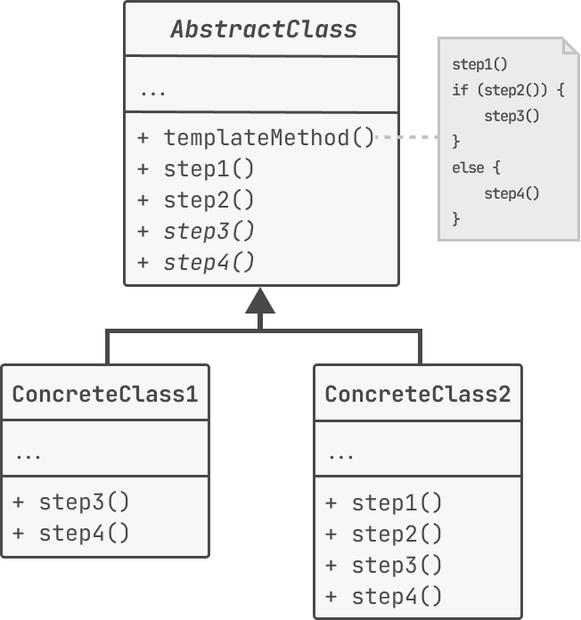 템플릿 메소드 패턴을 구성하는 주요 클래스에는 Abstract Class, Concrete Class 2가지가 있다. 두 클래스의 역할과 클래스 간 관계를 나타내는 UML 클래스 다이어그램은 다음과 같다.
