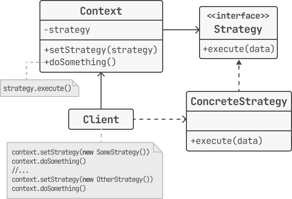 | Context | - 작업의 전체적인 구조(템플릿)를 정의하며 여러 Concrete Strategy 중 하나에게 알고리즘의 실행을 위임 - Strategy 구현 객체에 대한 참조를 가짐 - Context는 작업을 수행하기 위한 적절한 Concrete Strategy를 선택할 책임이 없으며, 실제 Concrete Strategy의 구현 내용은 알지 못하고 단순히 실행을 위임 - 일반적으로 생성자를 통해 Concrete Strategy를 주입받지만, 런타임에 동적으로 Concrete Strategy를 변경하기 위해 setter를 제공 |