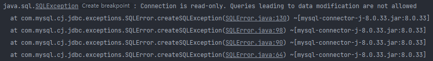 어떻게 보면 Business 계층을 FacadeService와 Service 2개의 계층으로 나누었기 때문에 FacadeService, Service 계층 모두 @Transactional 어노테이션을 신경써서 붙여줘야 한다. 즉 중첩되는 트랜잭션을 더 신경써서 관리해줘야 한다. 만약 FacadeService 메소드에서는 @Transactional(readOnly = true)로 읽기 전용 트랜잭션을 열어주었지만 Service에서는 쓰기 작업을 한다면 다음과 같은 오류가 발생할 수 있다.