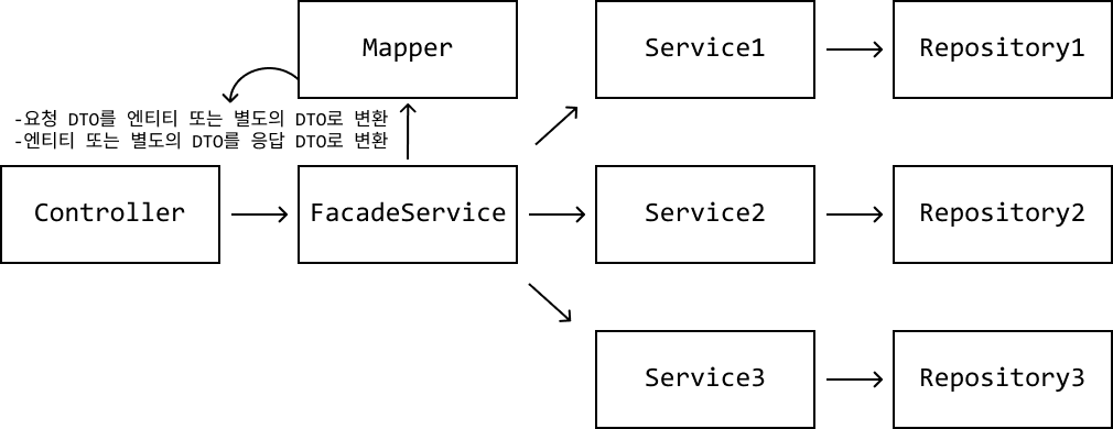 그러나 이 문제는 기존 Service 간 의존관계를 맺는 경우에도 발생할 수 있는 문제이긴 한다. 다음으로는 단순히 FacadeService ↔ Service 계층 간 데이터 전달을 위해 별도의 DTO를 정의함으로써 중복되는 DTO가 증가한다는 단점이 있다. 그러나 현재는 DTO가 중복되지만 미래에는 어떤 변경 사항이 발생할지 모를 일이므로 자연히 해결될 수 있는 문제이다.
