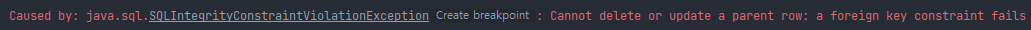 부모 엔티티 삭제 시 자식 엔티티를 어떻게 처리할지 따로 지정해주지 않으면, 다음과 같이 DB 상에서 FK 제약 조건을 위반했다는 오류를 뱉으면서 요청 처리에 실패하게 된다.