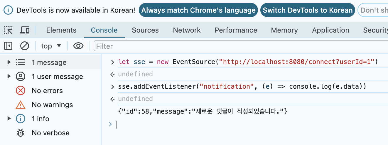 메소드에서 이벤트 ID를 설정하여 보냈기 때문에, 클라이언트는 재연결 요청 시 가장 마지막에 수신한 이벤트 ID를 Last-Event-ID