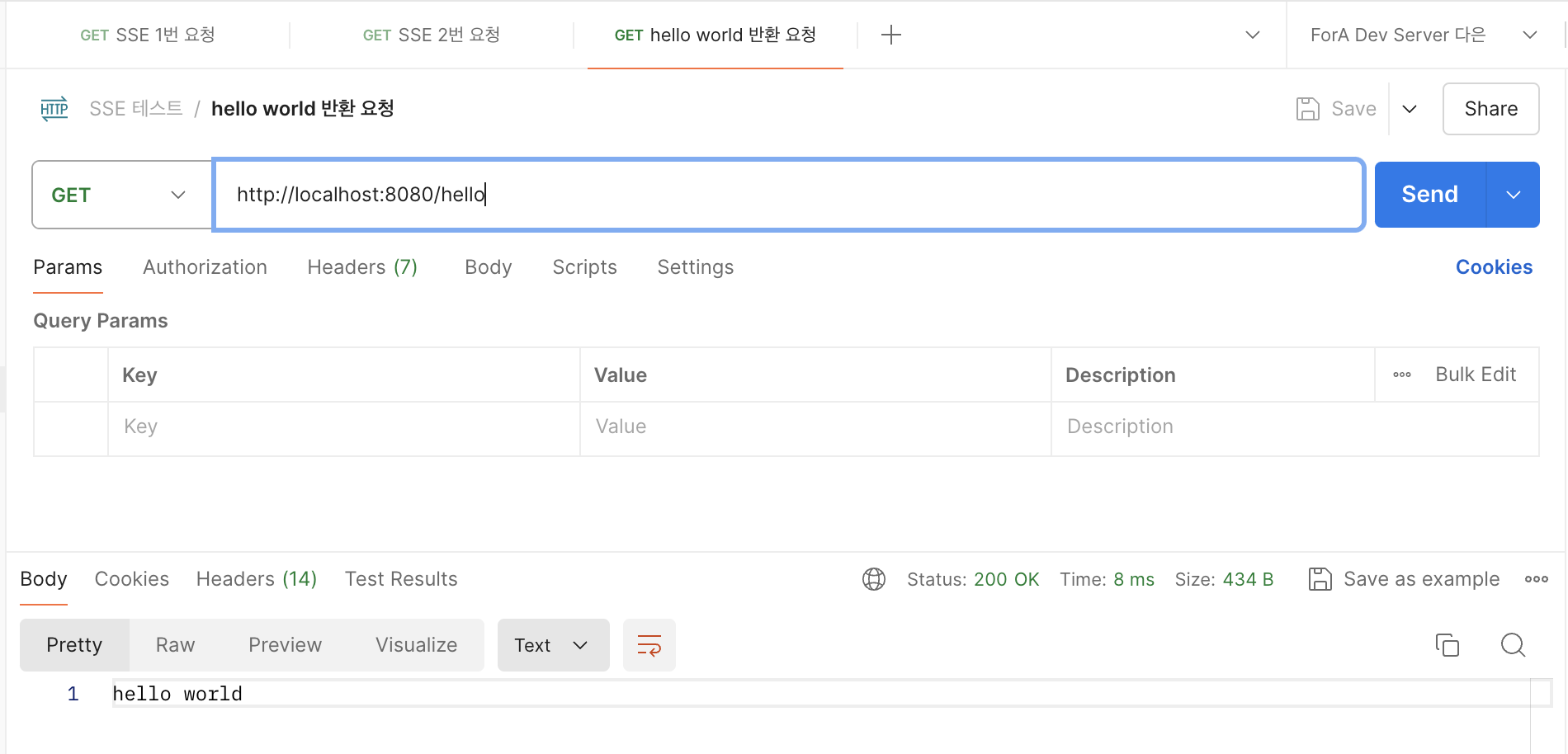 SSE 연결이 2개로 max-connections인 3보다 작으므로, 단순 "hello world"를 반환하는 GET /hello API를 정상 호출할 수 있으며 응답 또한 원하는 대로 떨어졌다. (GET /hello API 호출 시에도 2개의 SSE 연결 유지 중) maxThread 값을 1로 설정했음에도 불구하고 응답이 정상적으로 떨어진 것을 보면 SSE 연결이 종료될 때까지 쓰레드를 점유하지 않는다는 것을 알 수 있다.